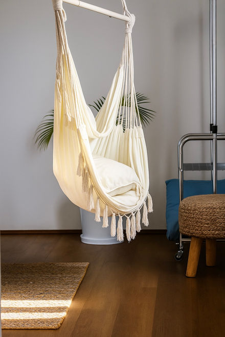 A calming bedroom designed to help you rest and recharge—complete with a private balcony, hammock chair, and minimalist clothing rack—where mornings feel light and unhurried.